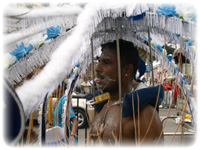 この祭りの見所は「カバディス」と言われる孔雀の形のみこしの様な飾りを背負って歩く、男性信者です。